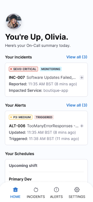 Incidents represent higher-severity issues that may impact multiple services or require coordinated response efforts. The mobile app provides full incident management capabilities.