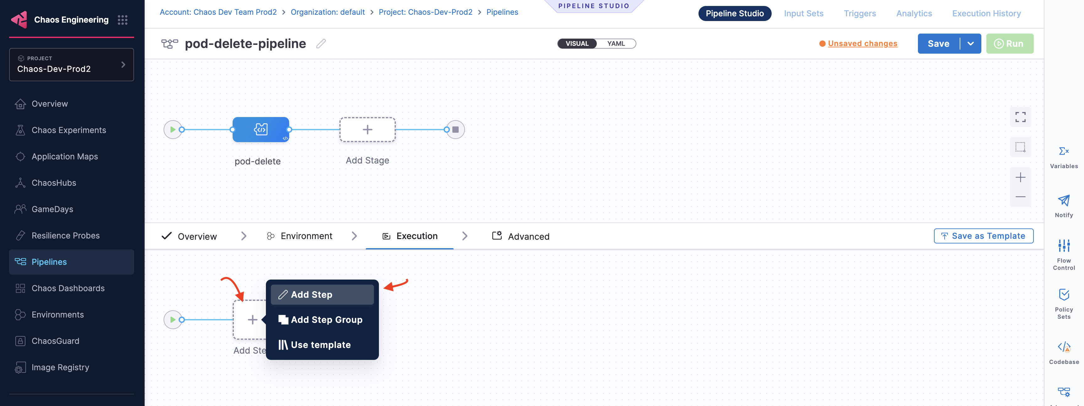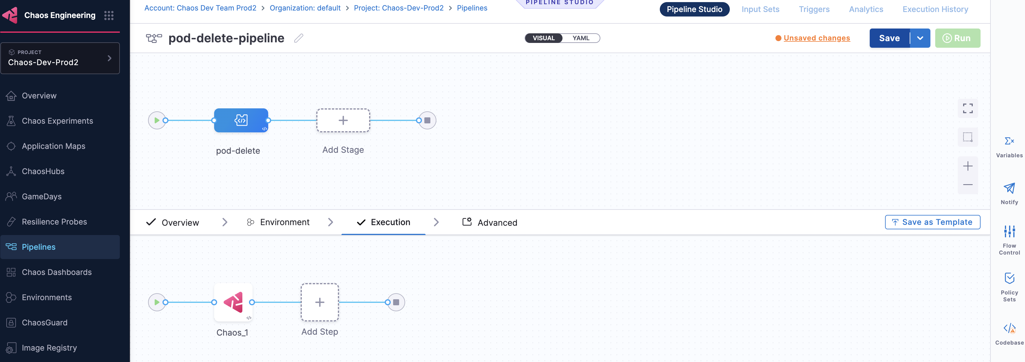 • Click Save to save the experiment to the Chaos Experiments page. You can add it to a ChaosHub later.