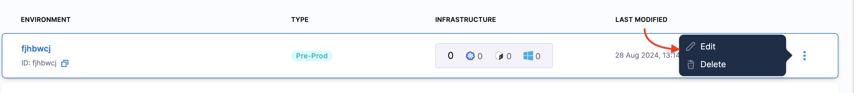 To edit or delete the environment, select the icon against the name of the environment.