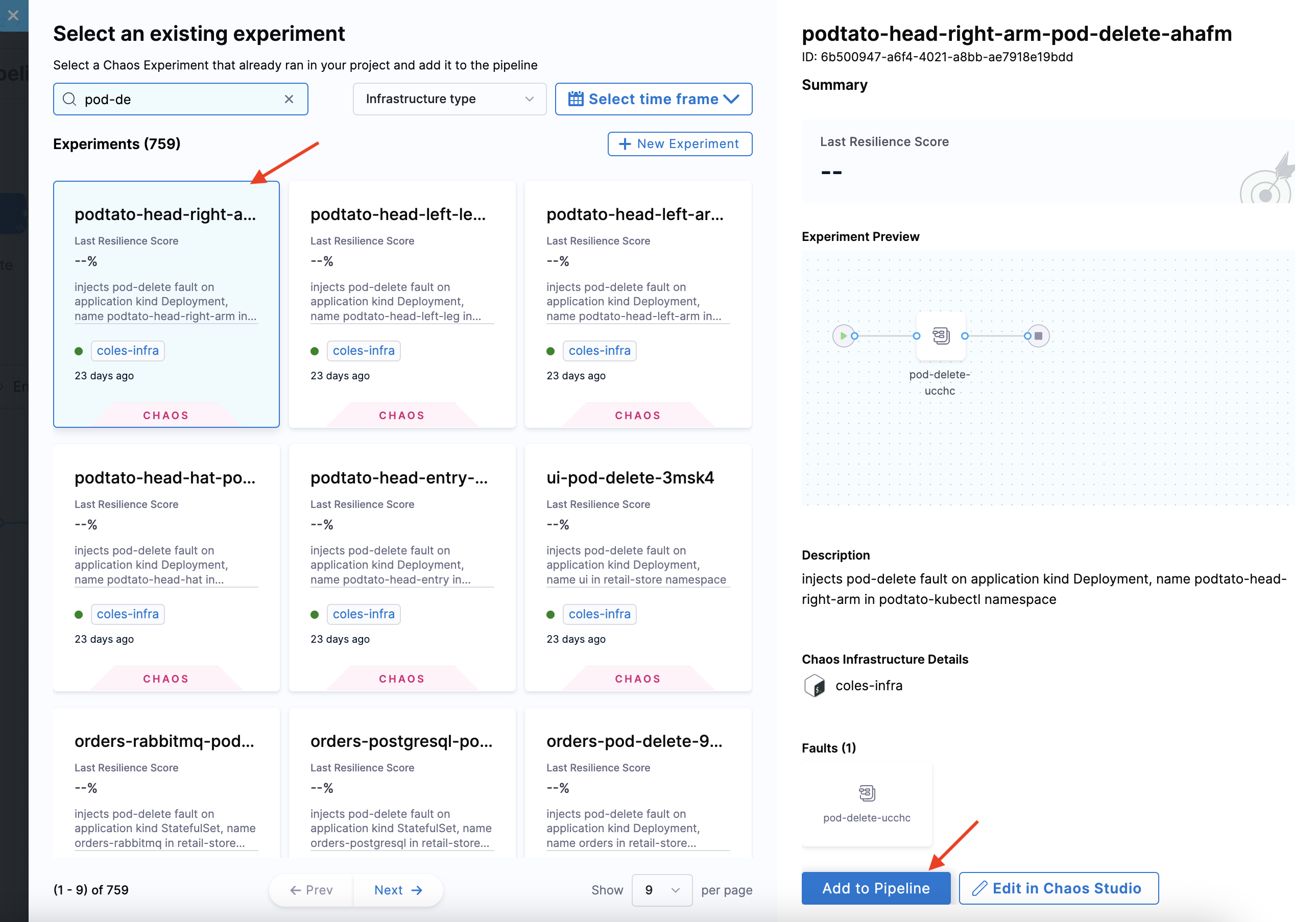8. Choose from the list of chaos experiments, and click Add to Pipeline.