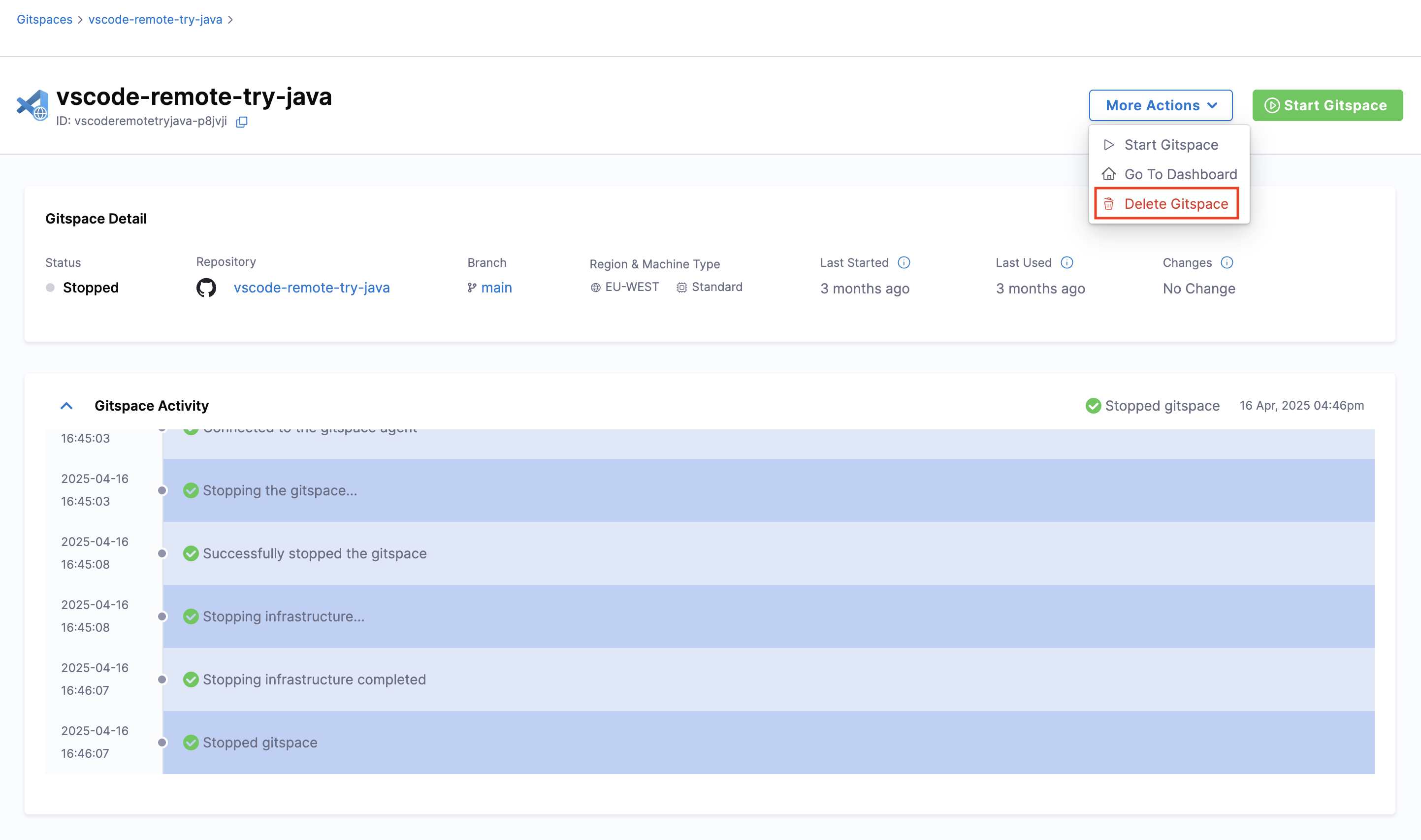 2. Click and go to the Gitspace Details UI for the specific Gitspace you want to delete. Click on More Actions -> Delete Gitspace.