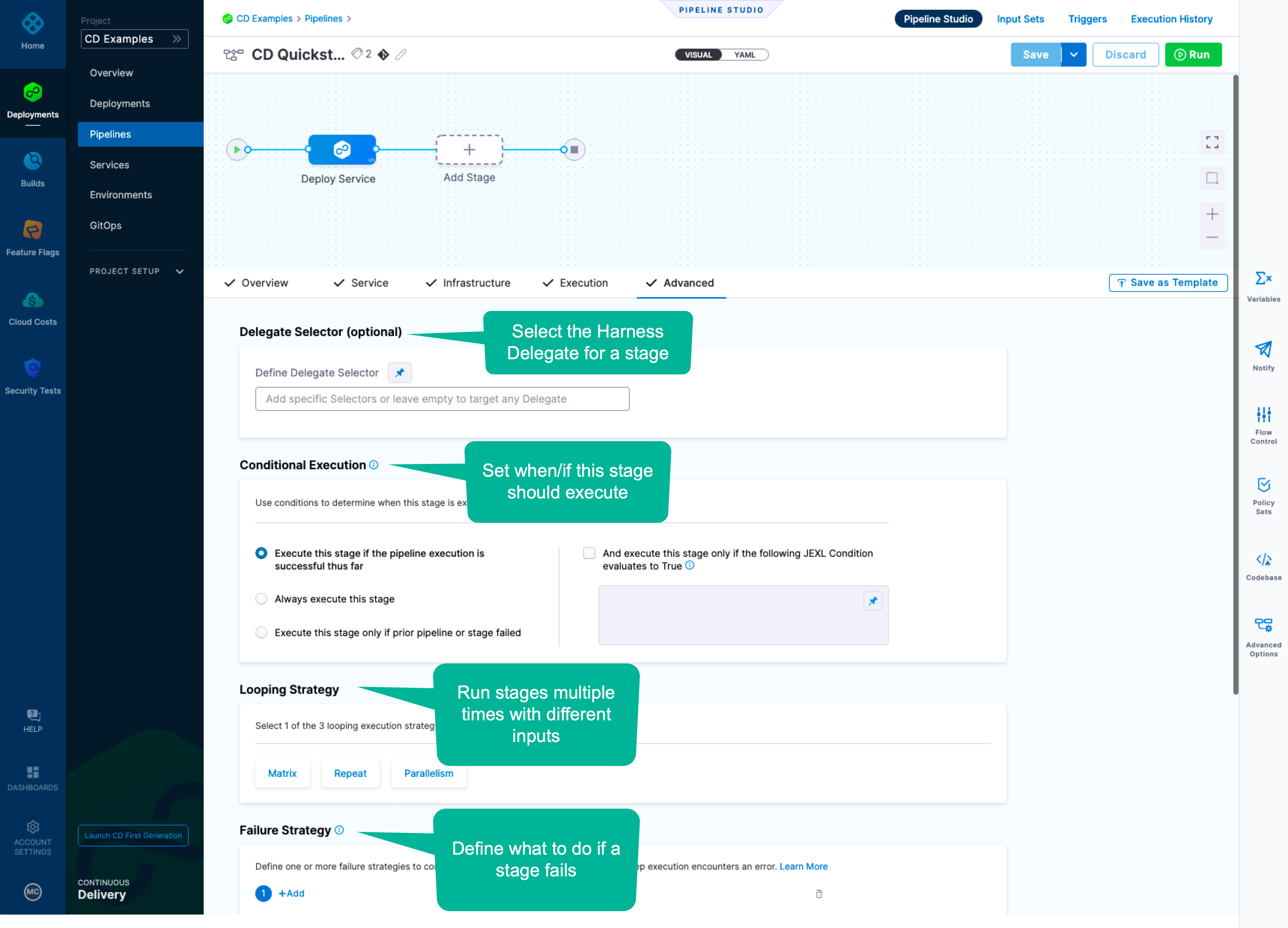 This topic provided a high-level overview of how you can model your software delivery process in Harness Continuous Delivery Pipelines and Stages.
