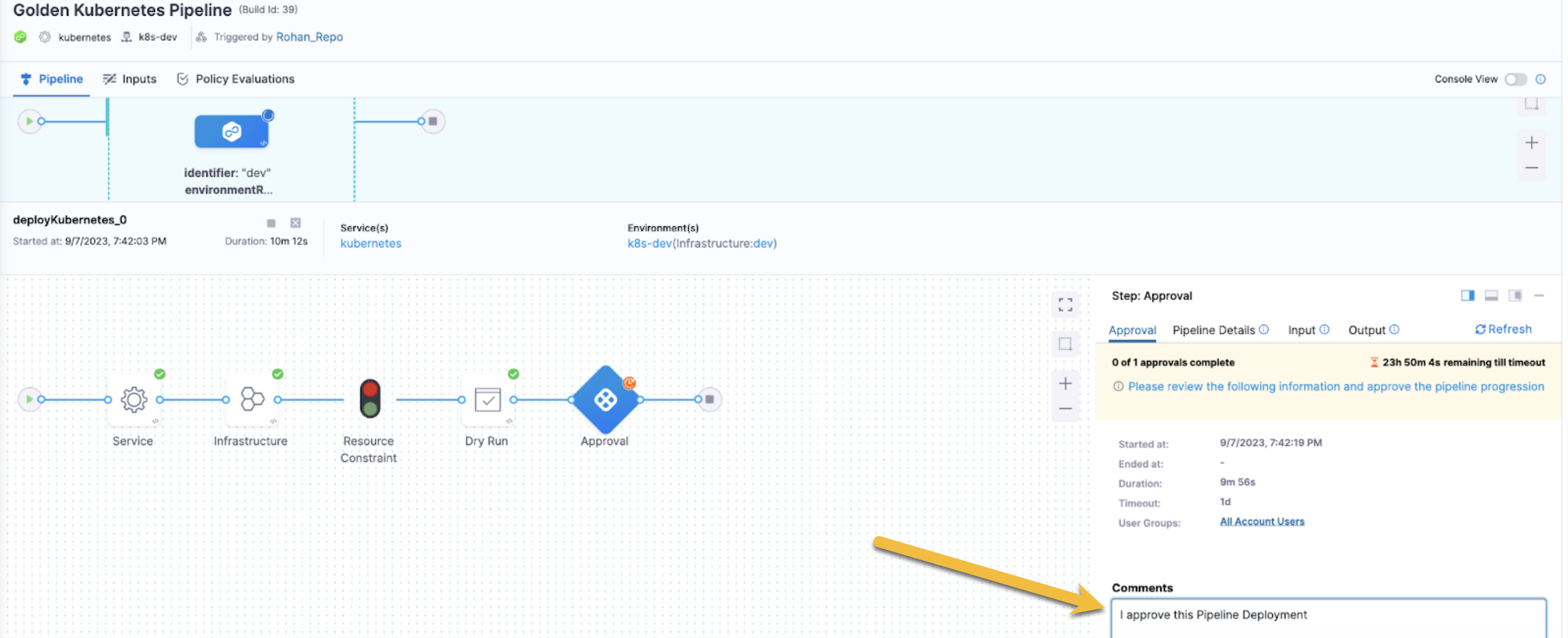 And in the pipeline, you can view and add comments to your approval. This information will be stored and logged with the pipeline for auditing.