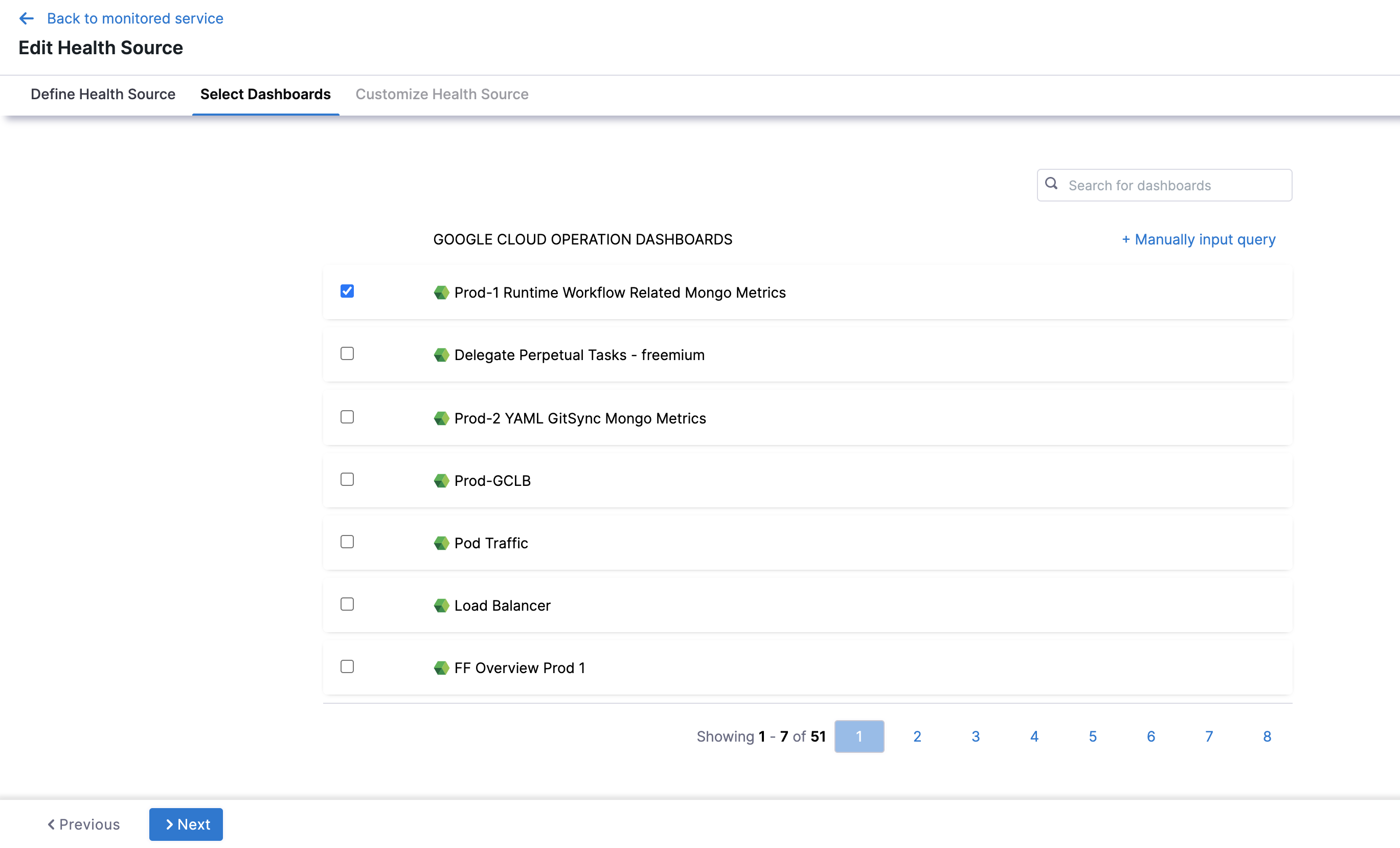 Click one or more dashboards from the displayed results. If you don't have any pre-existing dashboards or don't want to select the ones in the displayed result, click Manually input query.