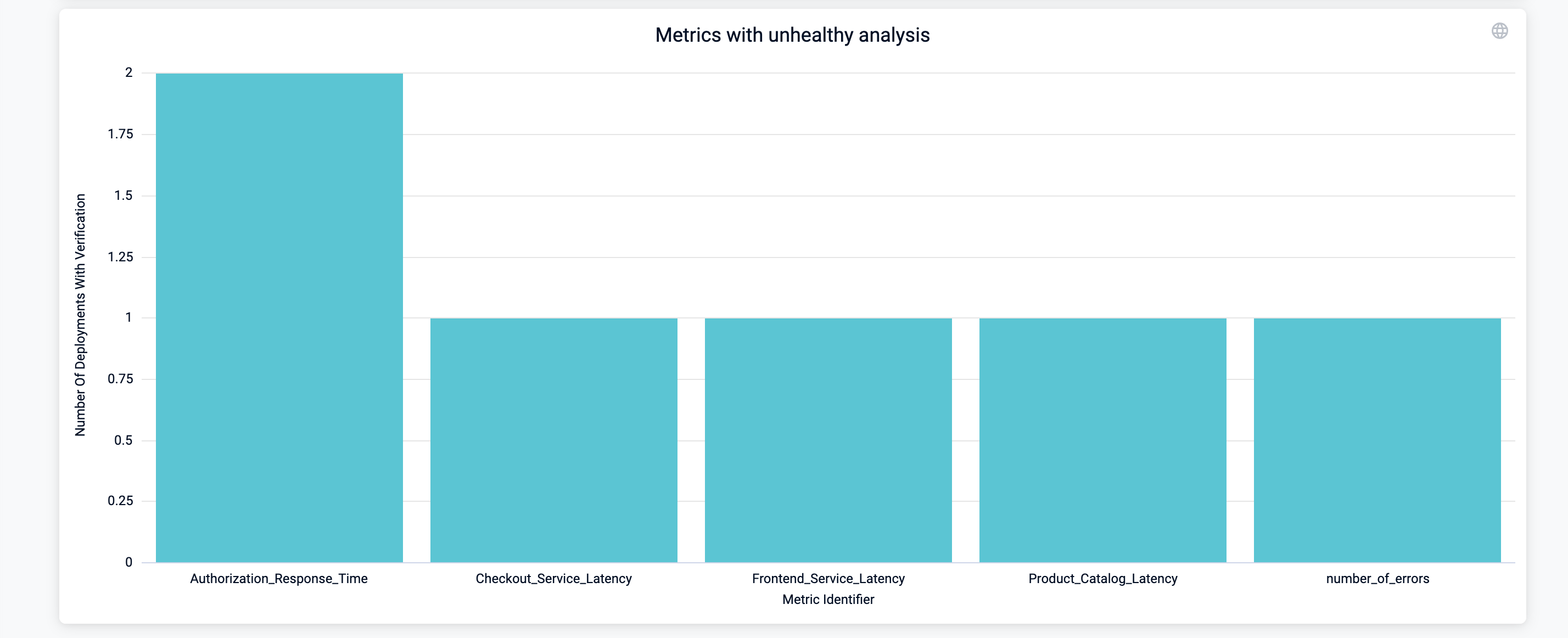 • Metrics with unhealthy analysis: Bar graph that displays the number of deployments with verifications that resulted in an UNHEALTHY analysis risk. Use this graph to track unhealthy metrics and understand what's causing the verification issues.