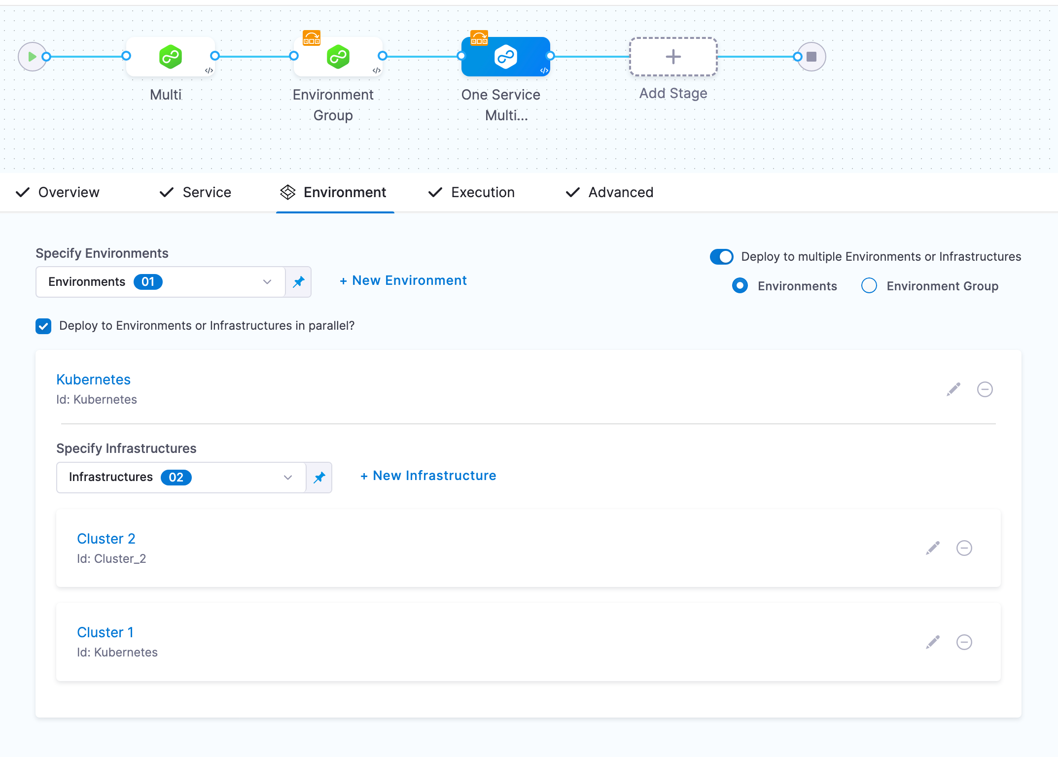 For example, let's say you host one infrastructure per customer and want to deploy your service to all customer infrastructures in the same pipeline. Instead of creating separate stages for each service and infrastructure combination, you can just deploy a single service to all infrastructures in the same stage.