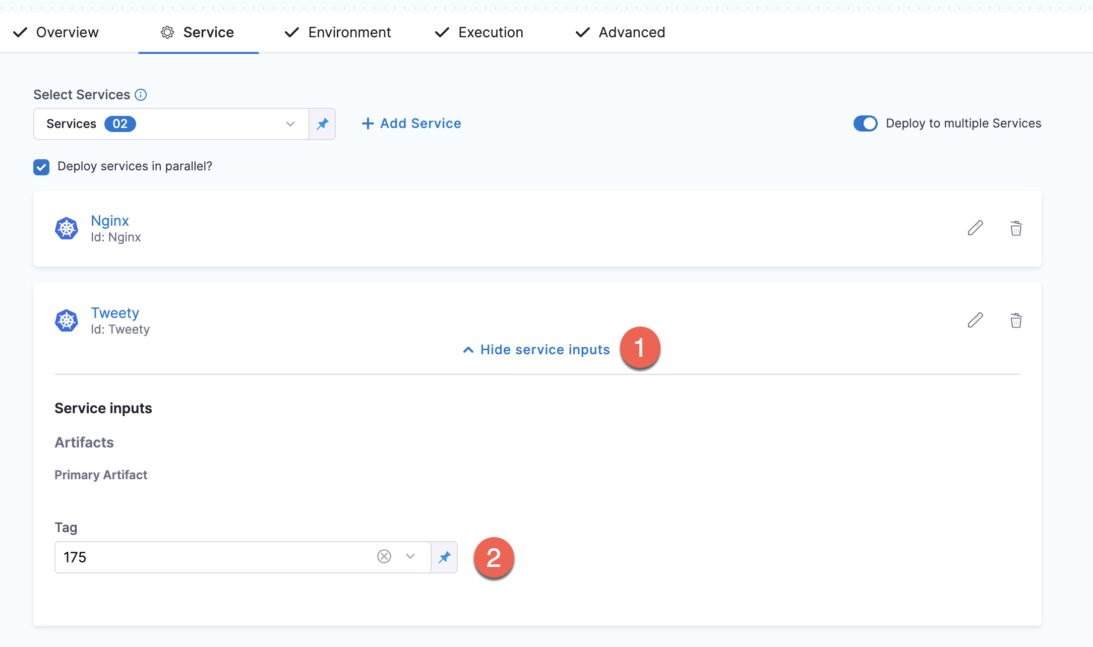 <+pipeline.stages.sampleStage.variables.resourceNamePrefix>, for multi environment, expression path changes and gets updated based on the iteration number of stage like this,<+pipeline.stages.sampleStage_1.variables.resourceNamePrefix>. - Runtime inputs for service overrides are not supported when using multi-service configuration.