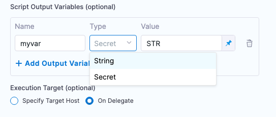 • Target Host: enter the IP address or hostname of the remote host where you want to execute the script. The target host must be in the Infrastructure Definition selected when you created the workflow, and the Harness Delegate must have network access to the target host. You can also enter the variable <+instance.name> and the script will execute on whichever target host is used during deployment.