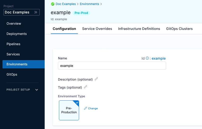 - Service Overrides: override specific services. You select a service and define what will be overridden whenever that Service is deployed to this environment.