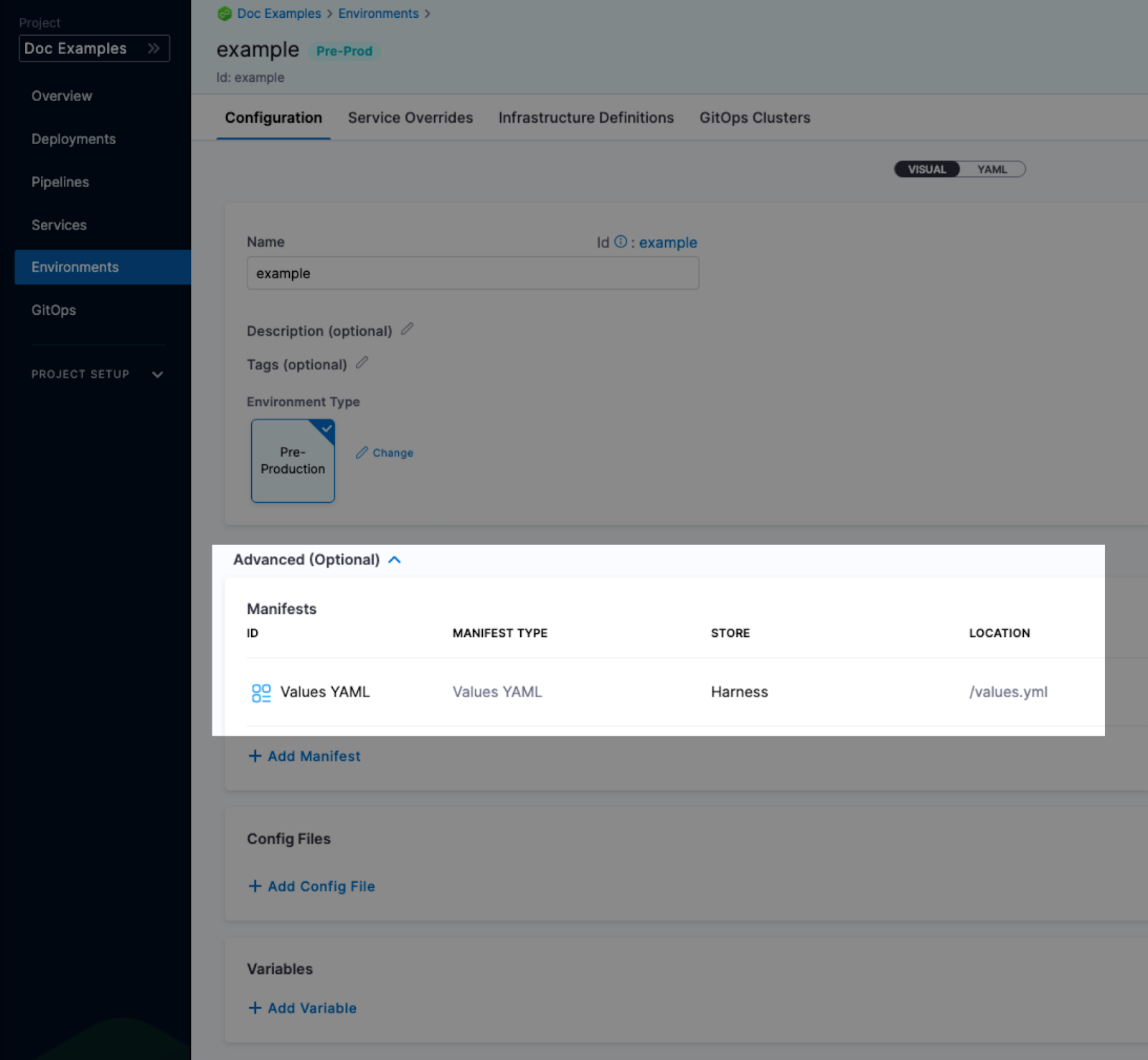 For example, a stage has a Kubernetes service with a manifest but whenever that service is deployed to the QA environment, the manifest in that environment's Configuration overwrites the namespace of the manifest in the service with QA.