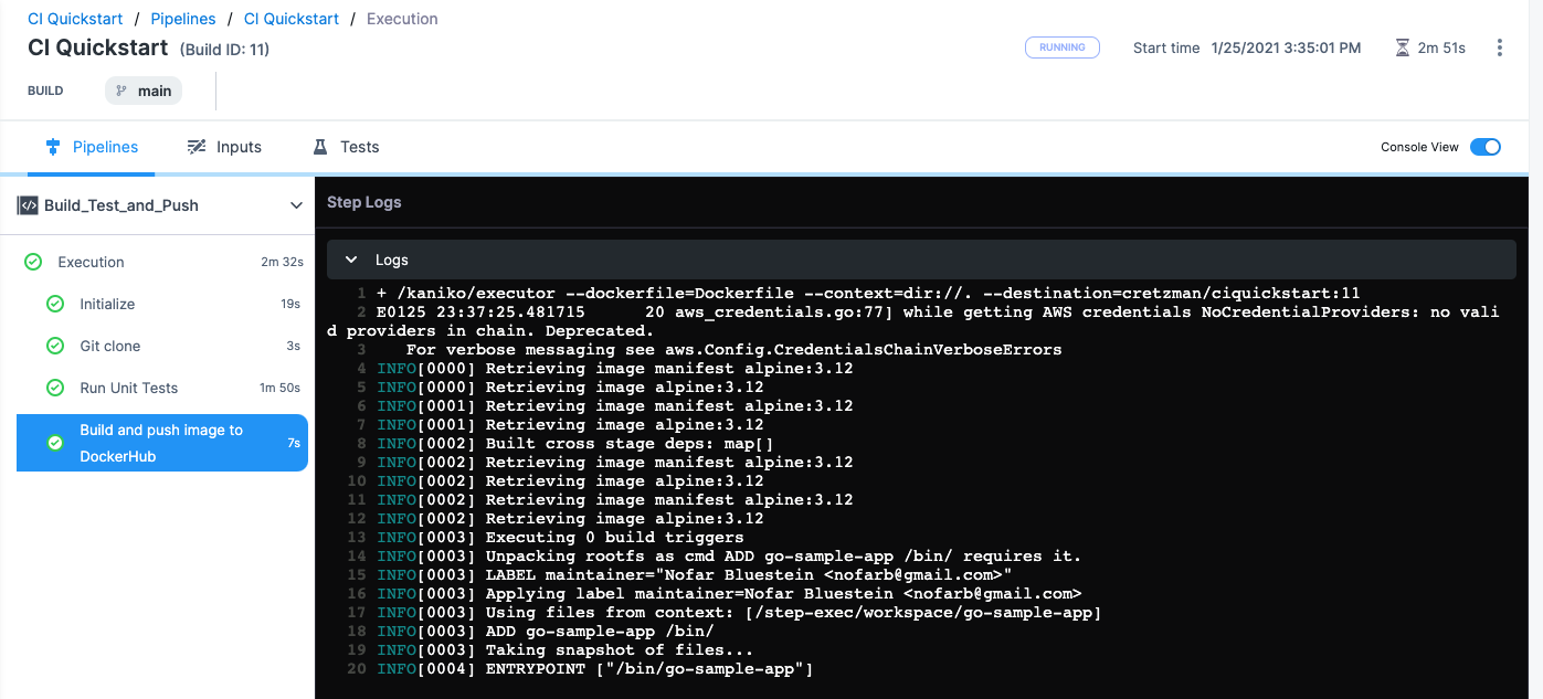 Now that the pipeline has a stage with a defined codebase and build infrastructure, you are ready to add steps to build the codebase, run unit tests, and push an artifact to Docker Hub. The first step will run unit tests and compile the codebase. The second step builds a container image and pushes it to a Docker Hub repo.