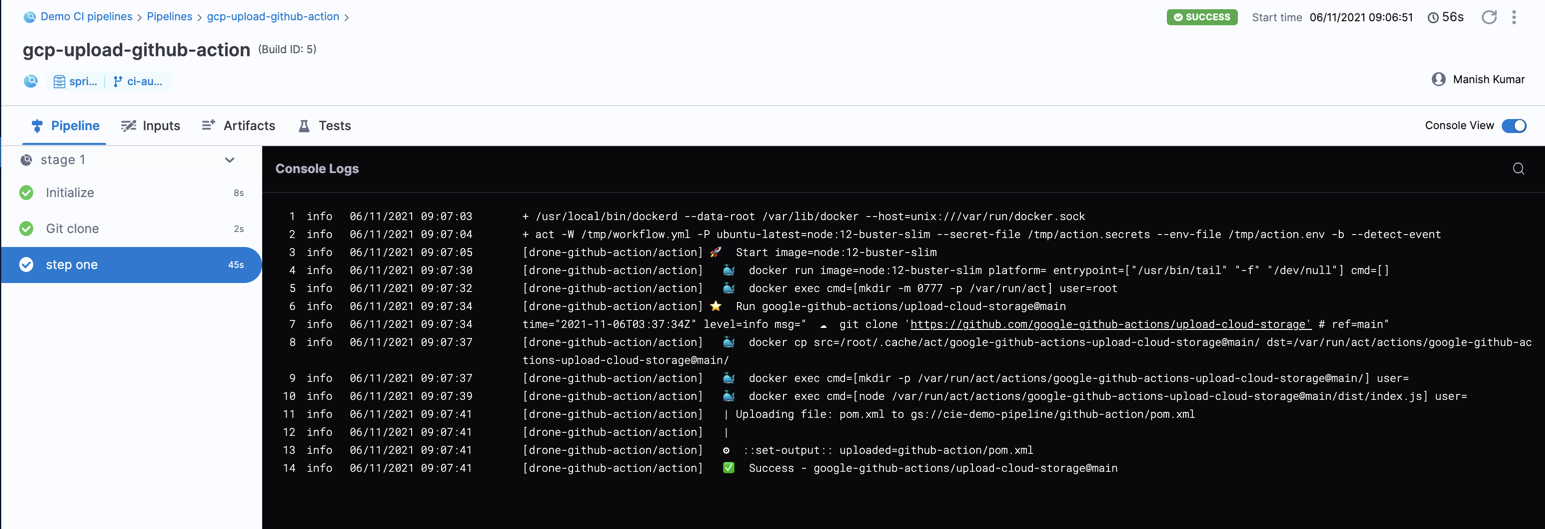 When you run the pipeline, you can observe the GitHub Action plugin logs in the build's logs.