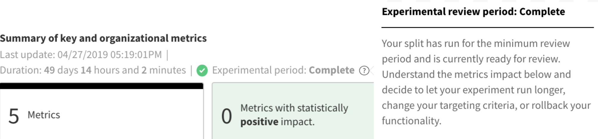 Making conclusions about your metrics impact during set review periods reduces the chance of errors and allows you to account for seasonality in your data. Split always shows your current metrics impact and if your review period has been reached.