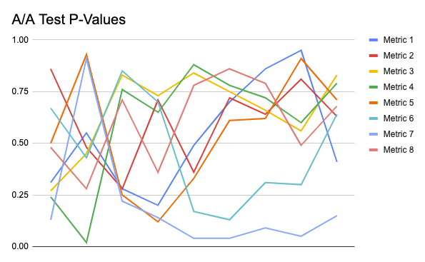 Below is a chart of p-values calculated for eight metrics at nine different times over the course of an A/A test: