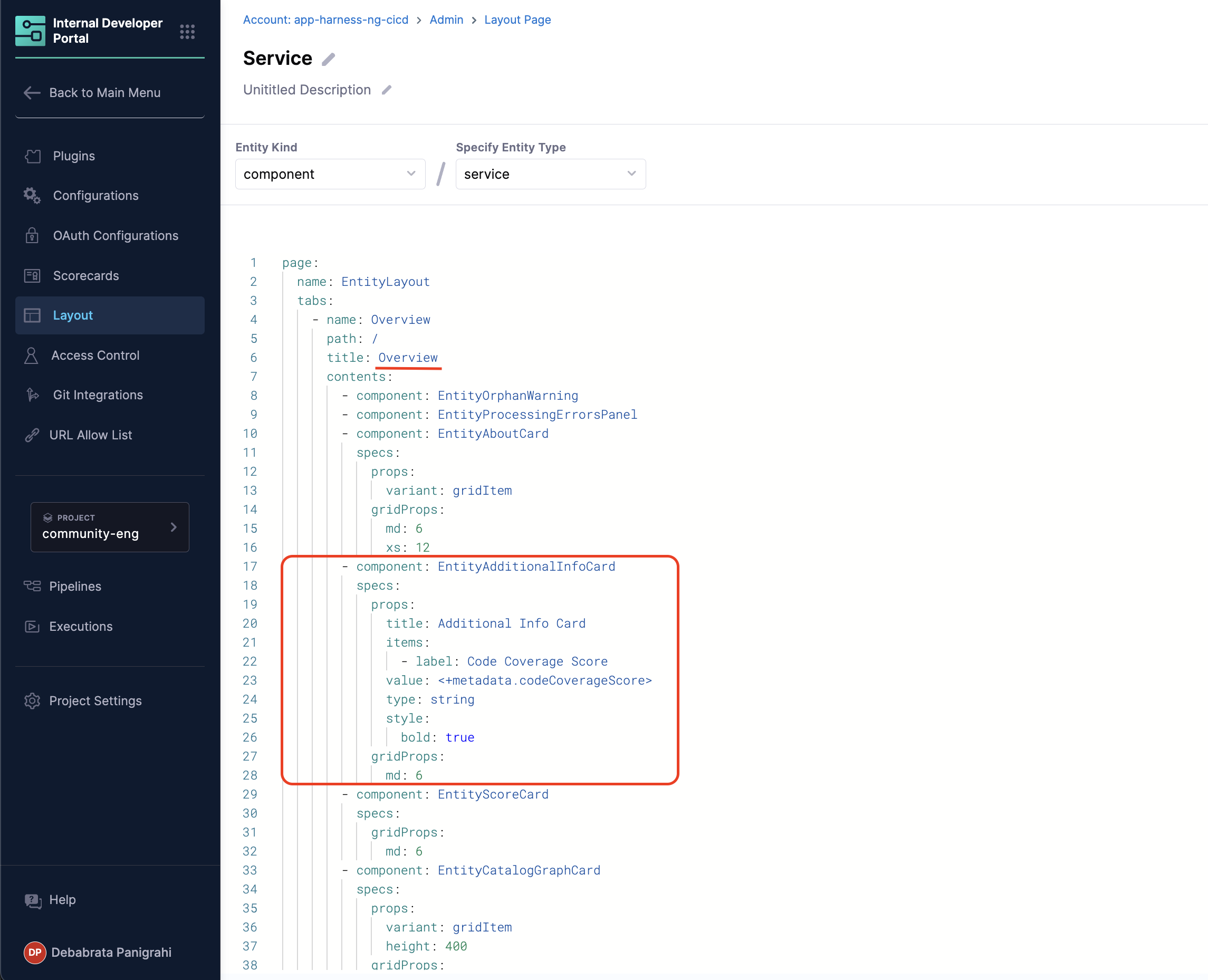Note: For detailed instructions on adding an Additional Info Card to display custom information on your entity's Overview page, see the Additional Info Card section in the Catalog Layout documentation.