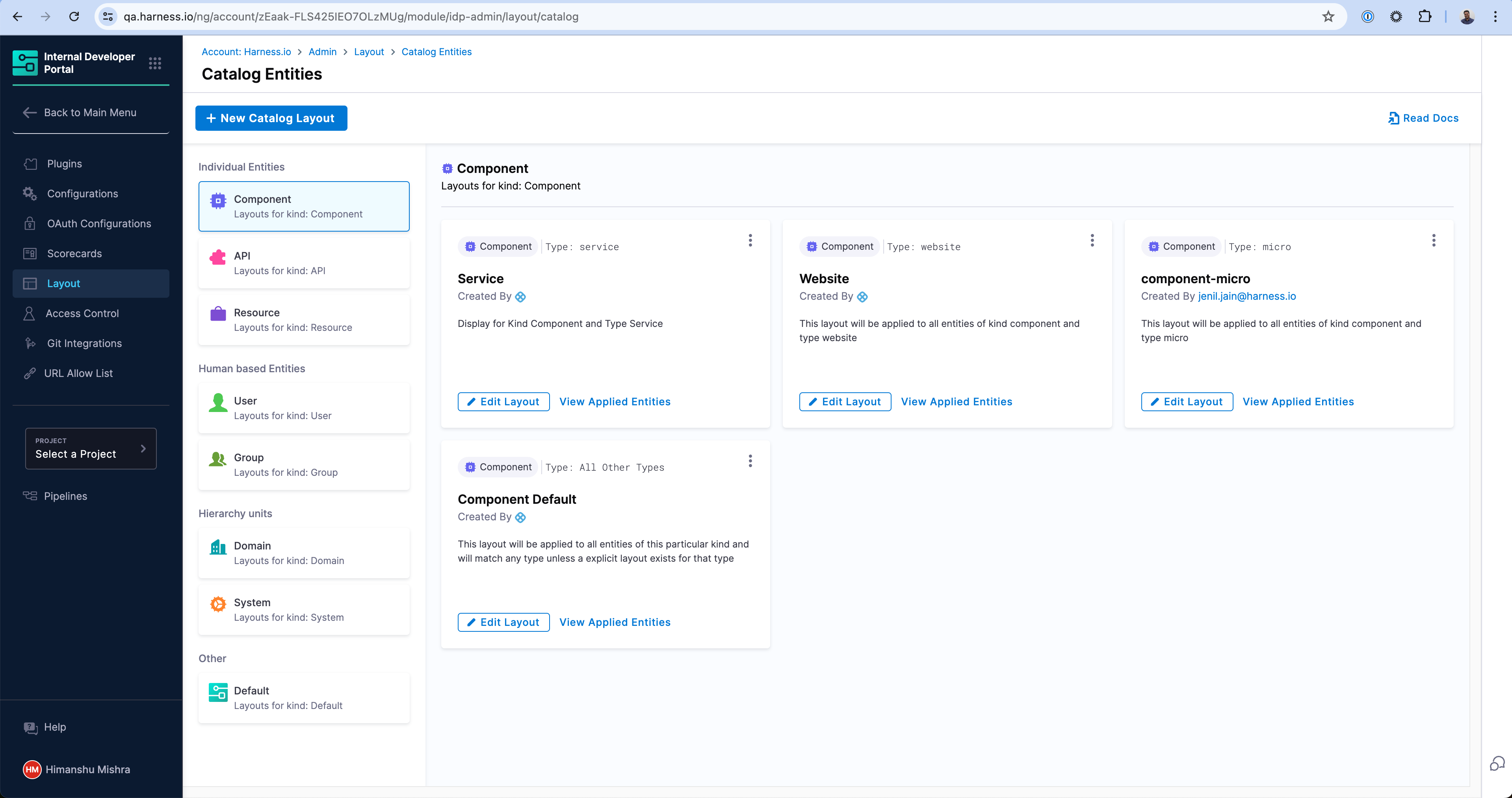 The Layouts are grouped by the kind of the Catalog entities and their use-cases in the sidebar. As you can see there are a number of layouts possible for a particular kind. For example, the first layout in the screen will match any Catalog entity with kind: Component and spec.type: service. Similarly, there is a different layout for spec.type: website. At the end, there is a catch-all layout which will be used for any other type which has not been explicitly created above.