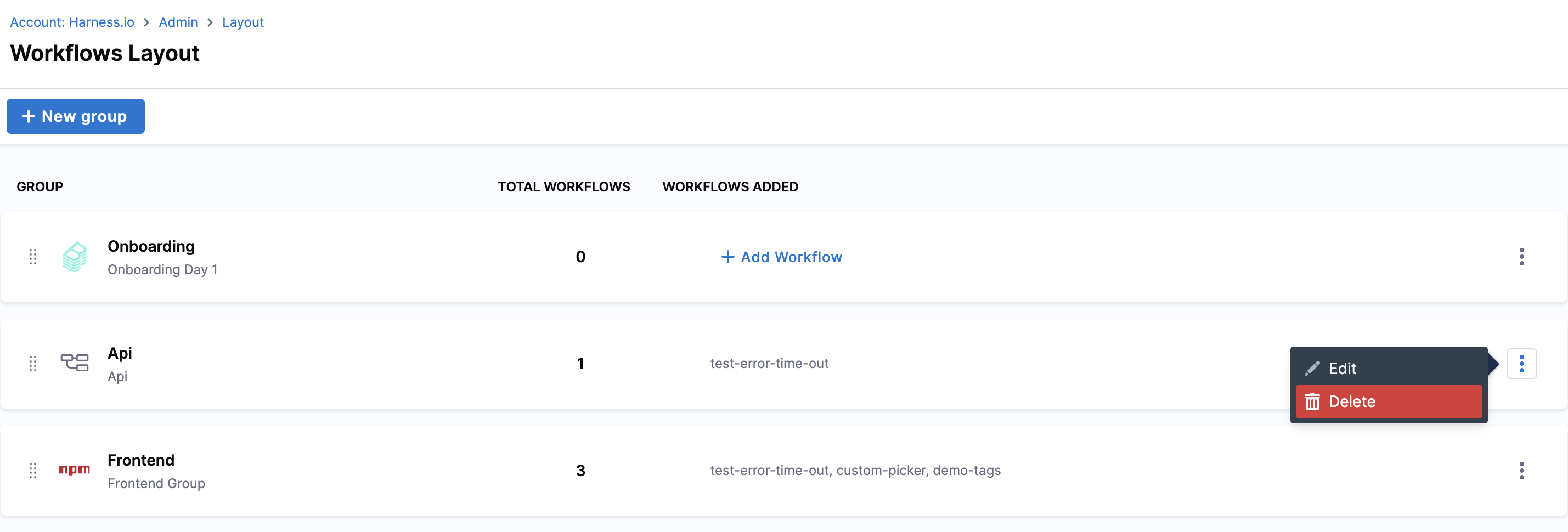 The option to create new groups is also available under the Workflows homepage which will take you to the Layout -> Workflows under Admin.