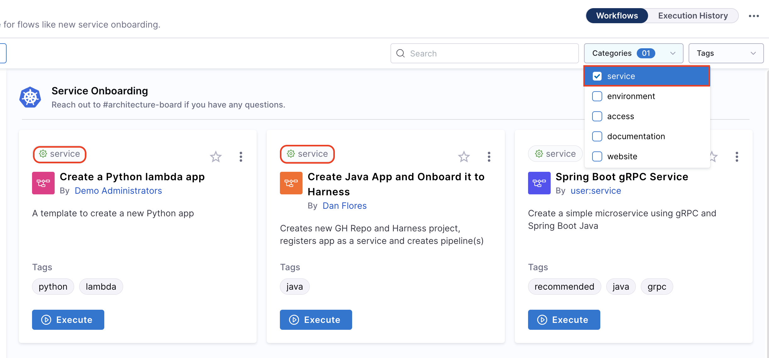 5. Tags & Categories: You can filter workflows based on tags and categories. Category is defined by spec.type in Workflow definition YAML.