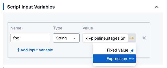 For Script Input Variables and Script Output Variables, you simply select Expression, and then paste in the Harness variable expression.