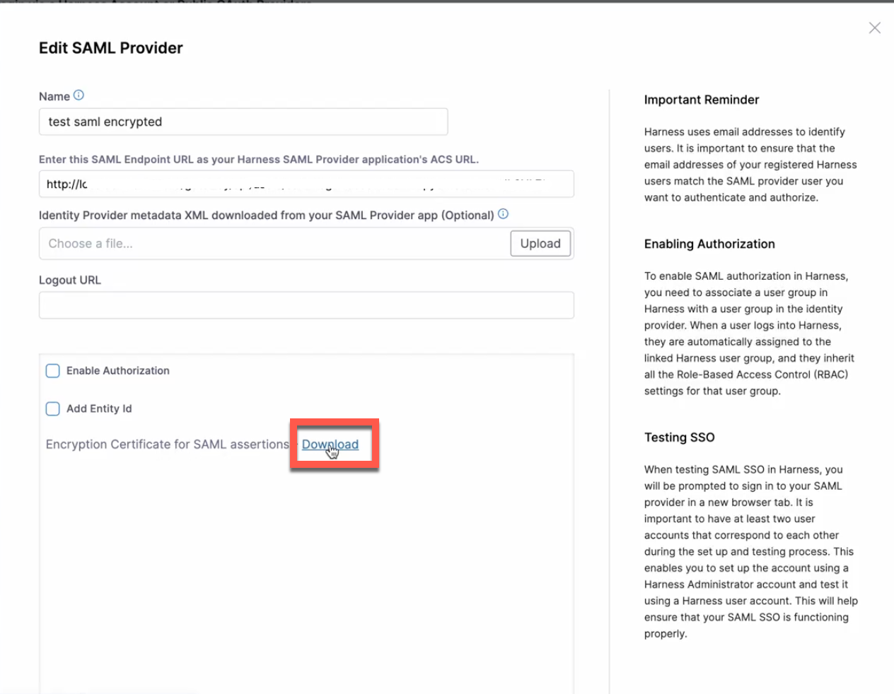 To use encrypted SAML with Harness, you download the encryption certificate from the Harness UI and upload it to your identity provider (IdP) settings to support the encrypted SAML flow.