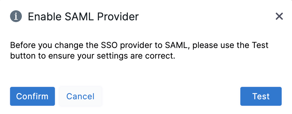 2. In the resulting Enable SAML Provider dialog, click TEST to verify the SAML connection you've configured.
