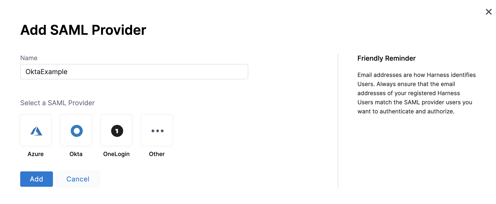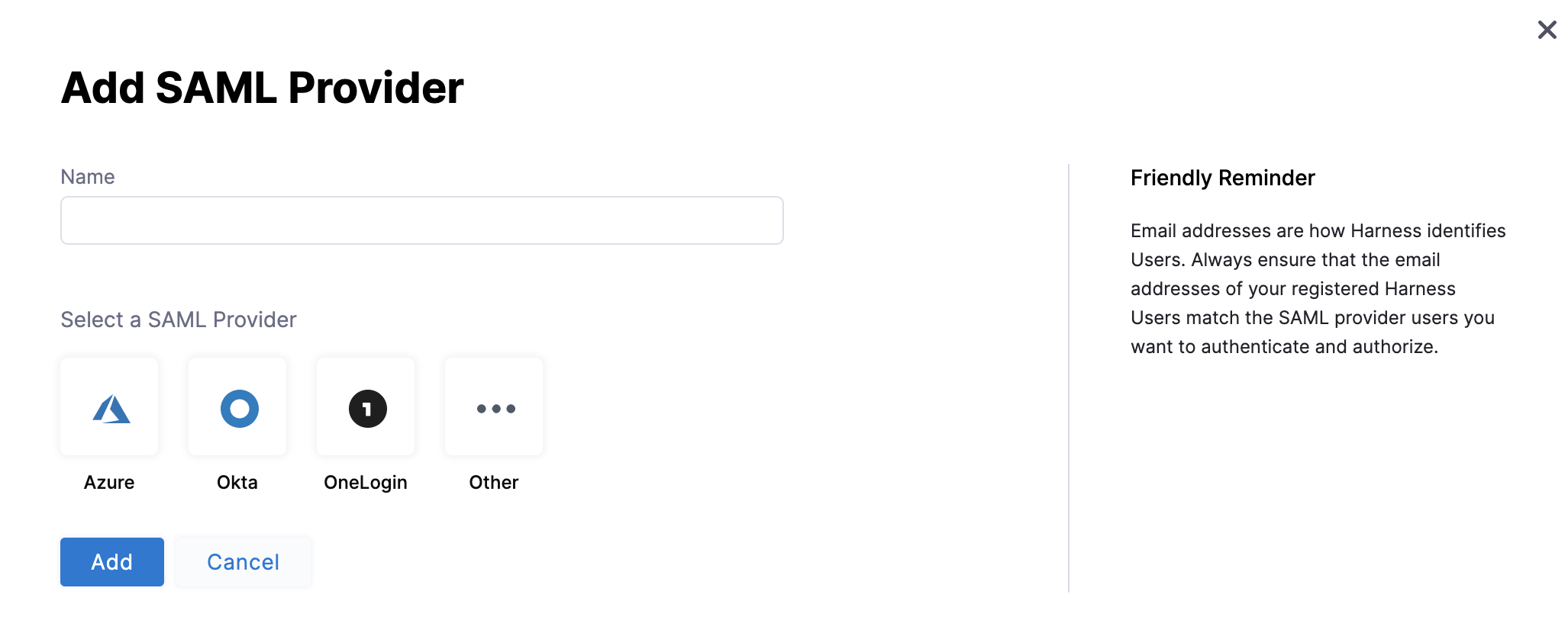 In your Harness tab, navigate to the Add SAML Provider page:
