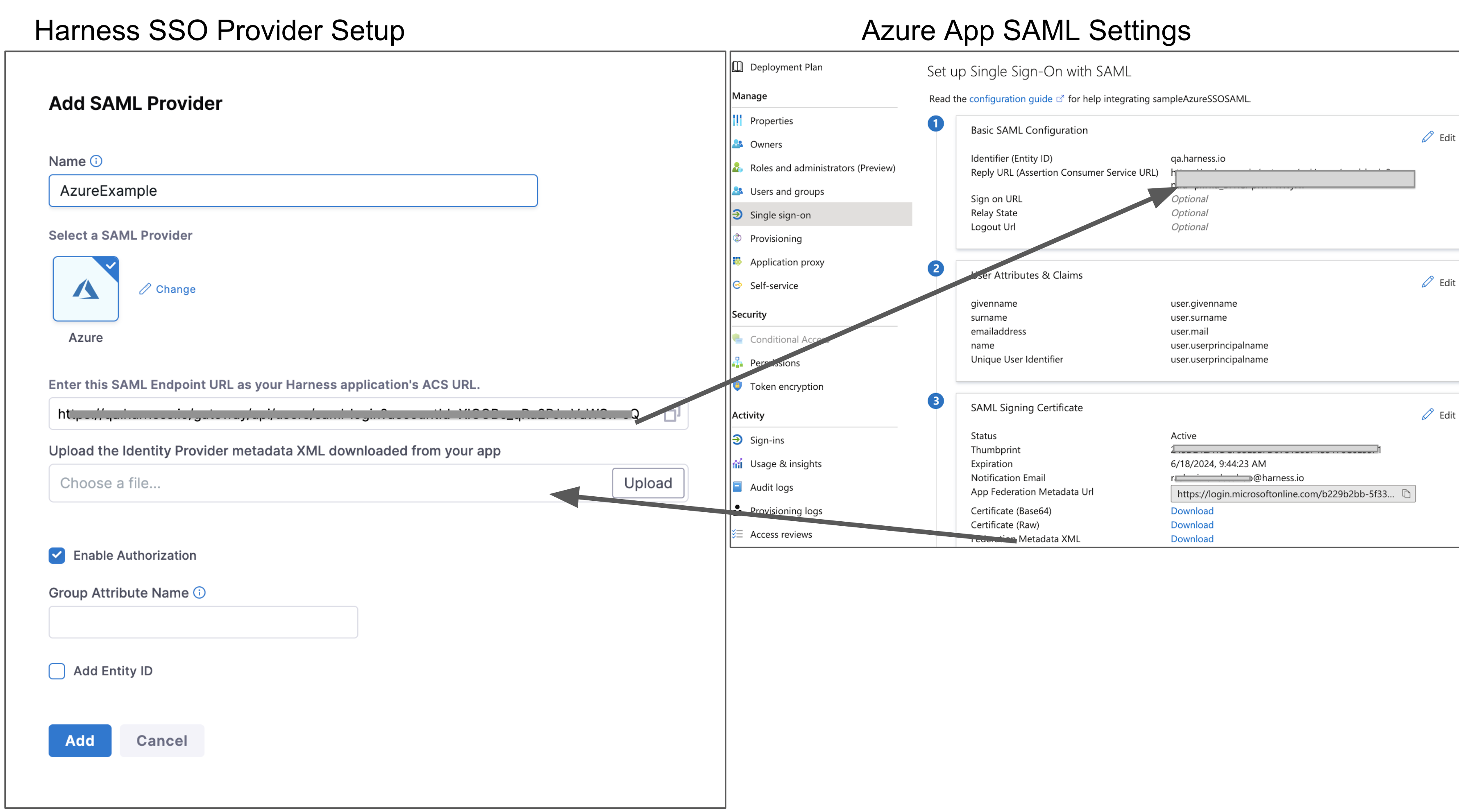 • SAML metadata file: This file is provided by your SAML provider app. You upload this file into the Harness Single Sign-On (SSO) Provider dialog to integrate the app with Harness.