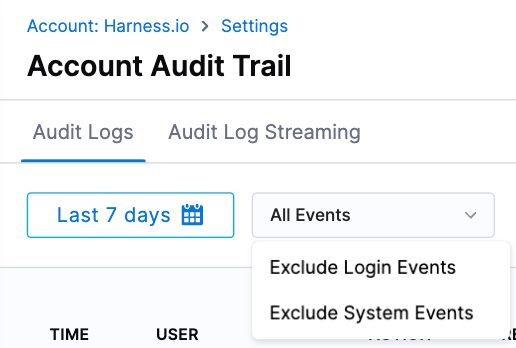 The Audit Trail page opens, displaying a record for each event that changed the setup of your Harness account, modules, or Harness entities. By default, Harness shows audit logs for the previous 7 days.