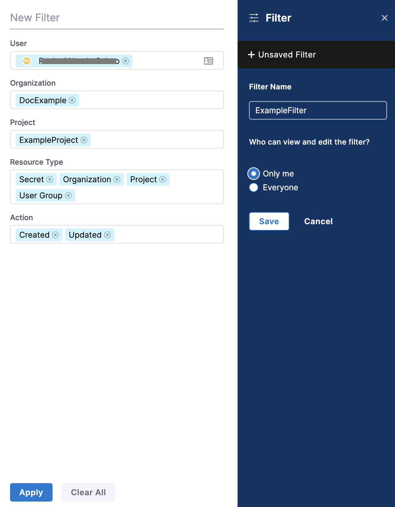 3. In the New Filter settings, select the filters to scope down the viewable audit events. You can scope down the viewable audit events by adding filters and selecting: