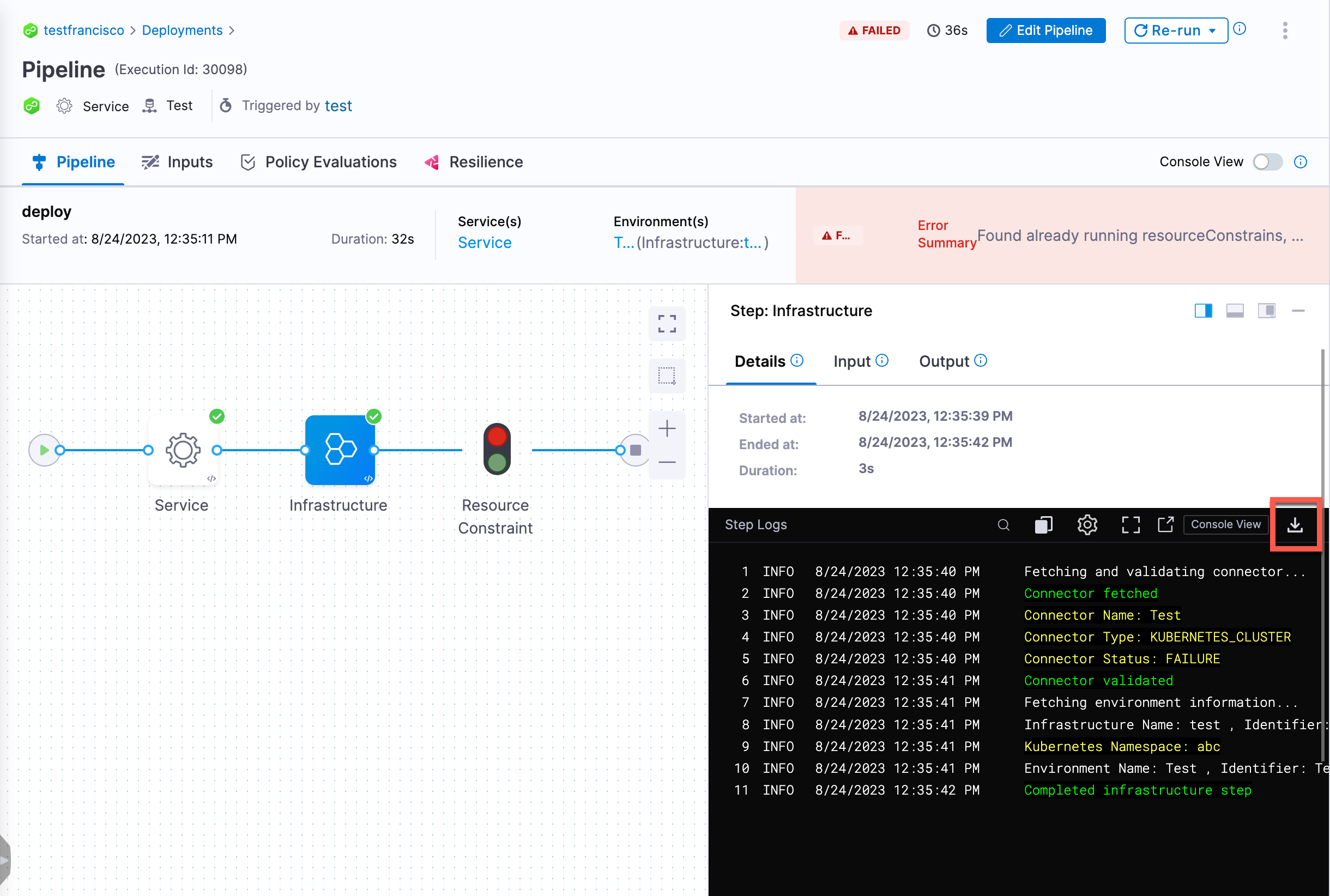 Currently, this feature is behind the feature flag SPG_LOG_SERVICE_ENABLE_DOWNLOAD_LOGS. Contact Harness Support to enable the feature.