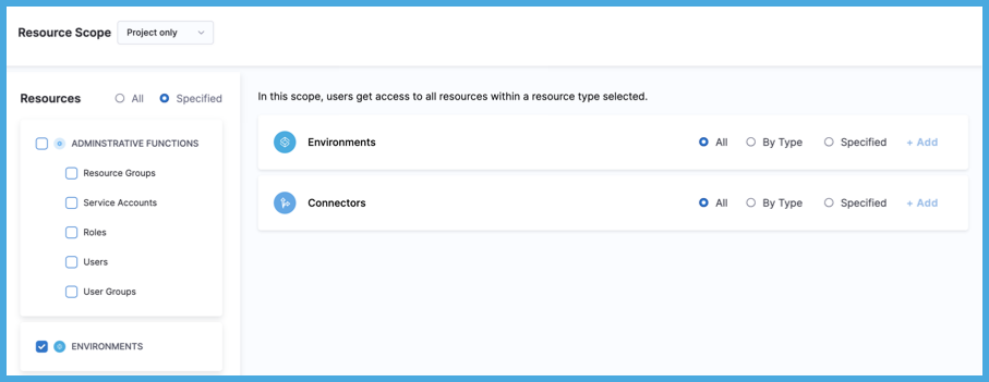 ABAC is in addition to the Resource Scope. For example, if the Resource Scope is Project Only, and you select connectors By Type, then the resource group includes all connectors of the selected types that are in the specified project only. For more information, go to Manage resource groups: Scopes and refinement.