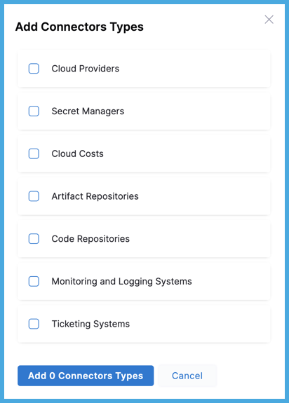For Connectors, you can choose one or more of the following Harness connector types: Artifact Repositories, Cloud Costs, Cloud Providers, Code Repositories, Monitoring and Logging Systems, Secret Managers, and Ticketing Systems.