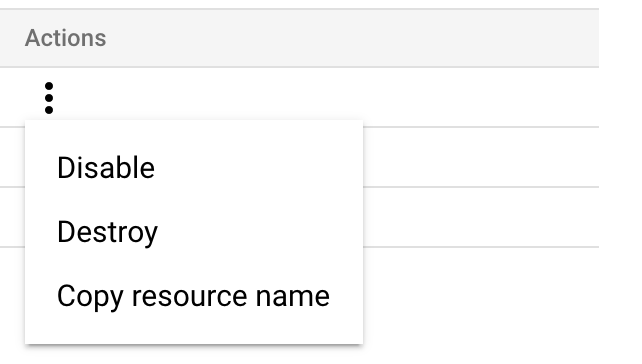 4. To create resources in this or the next step, go to Google Cloud's Creating Symmetric Keys topic. Open the Actions menu (⋮), and then select Copy Resource Name.