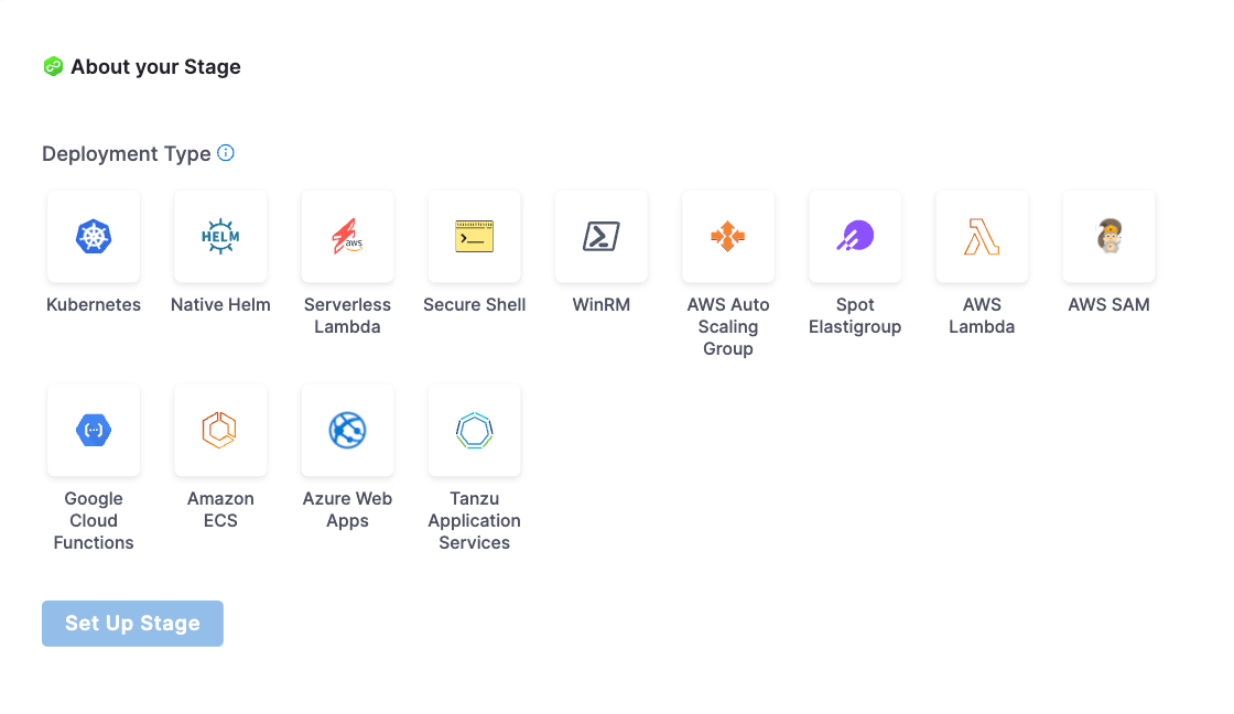 2. In Select stage type, select Deploy. The About Your Stage settings open.