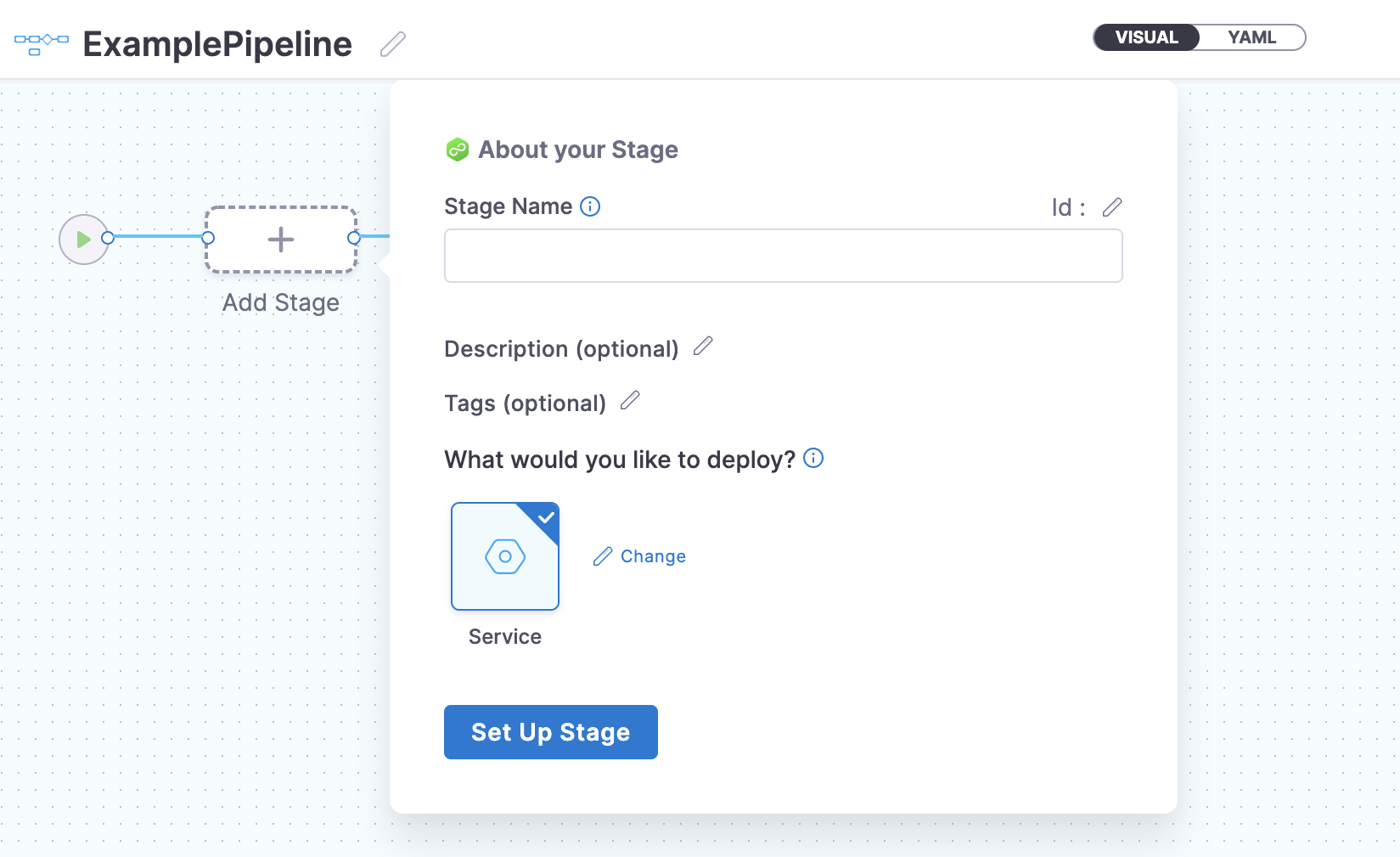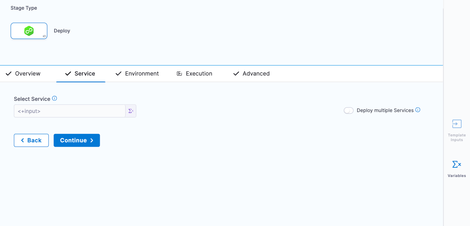 This example uses the Deploy stage. The Deploy stage type is a CD stage that enables you to deploy any service to your target environment.