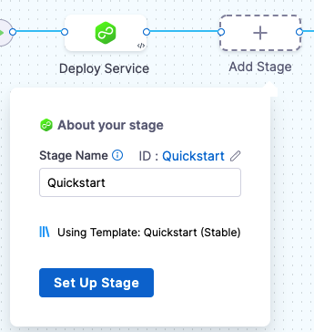 The About your stage dialog opens. Enter Quickstart, and then select Set Up Stage.