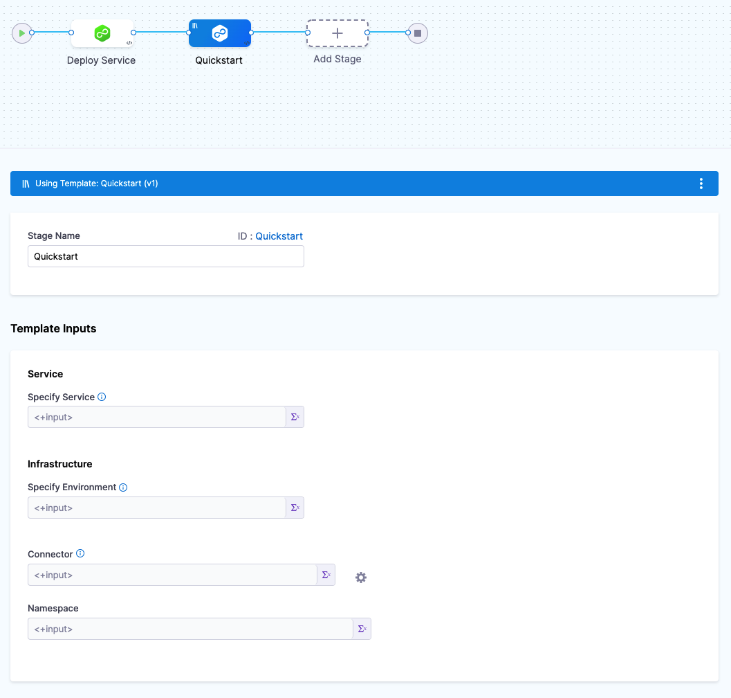 The stage template demonstrated in this topic uses runtime inputs. Runtime inputs are placeholders for values that you provide when you start a pipeline execution. For more information, go to Fixed values, runtime inputs, and expressions.