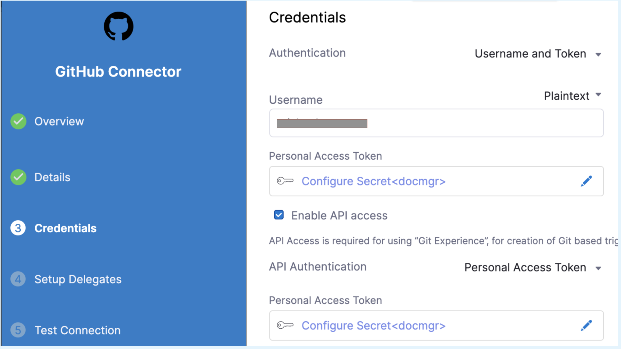 infoThe Git connector must use the Enable API access option and Username and Token authentication.
