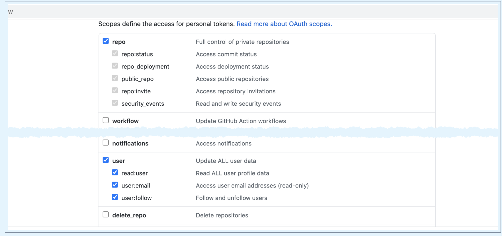 For GitHub, the token must have the following scopes:
