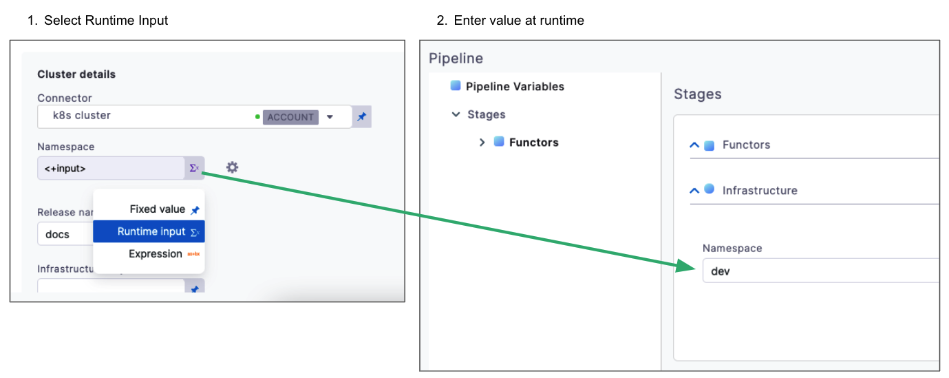 Runtime input provides a placeholder with the expectation that you'll define this value at runtime. For example, if you set the Kubernetes cluster Namespace setting to runtime input (<+input>), you'll need to provide the Namespace value when you run the pipeline.