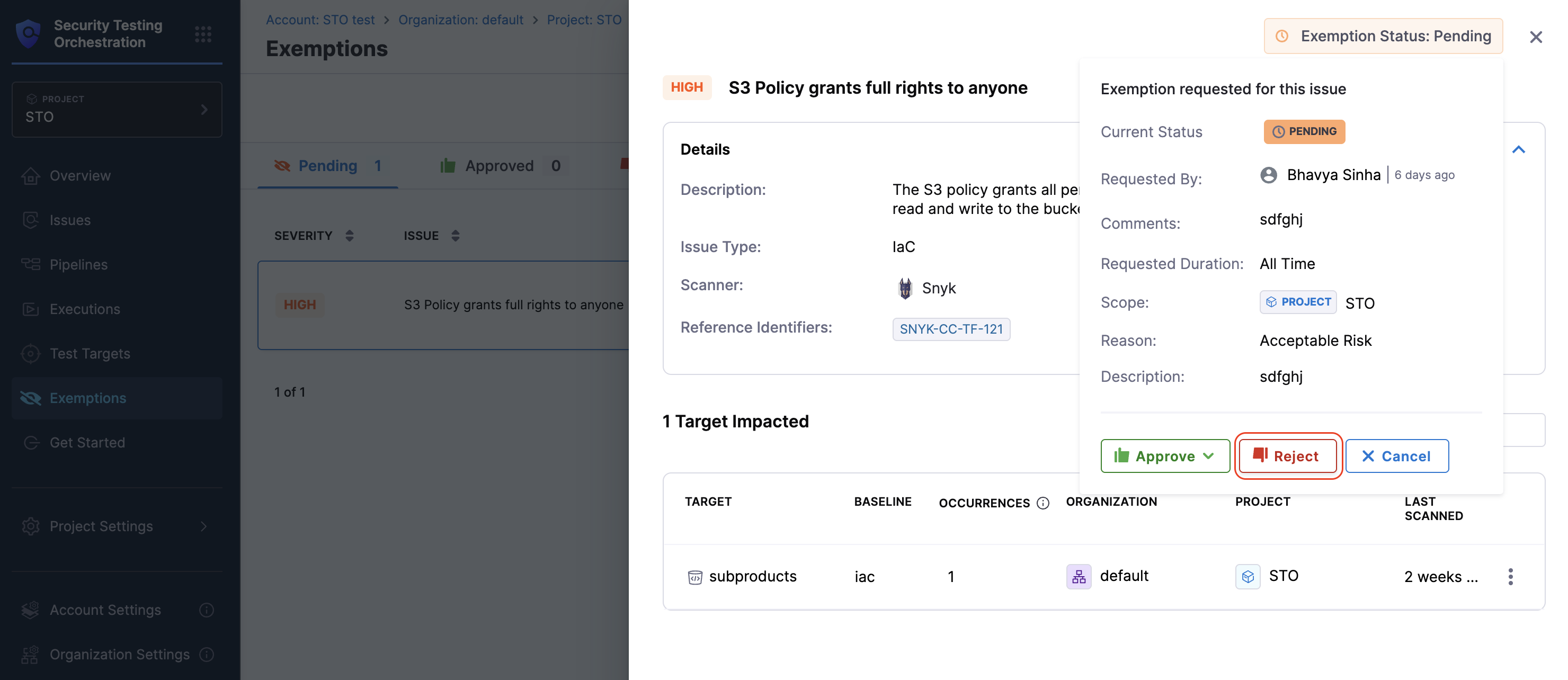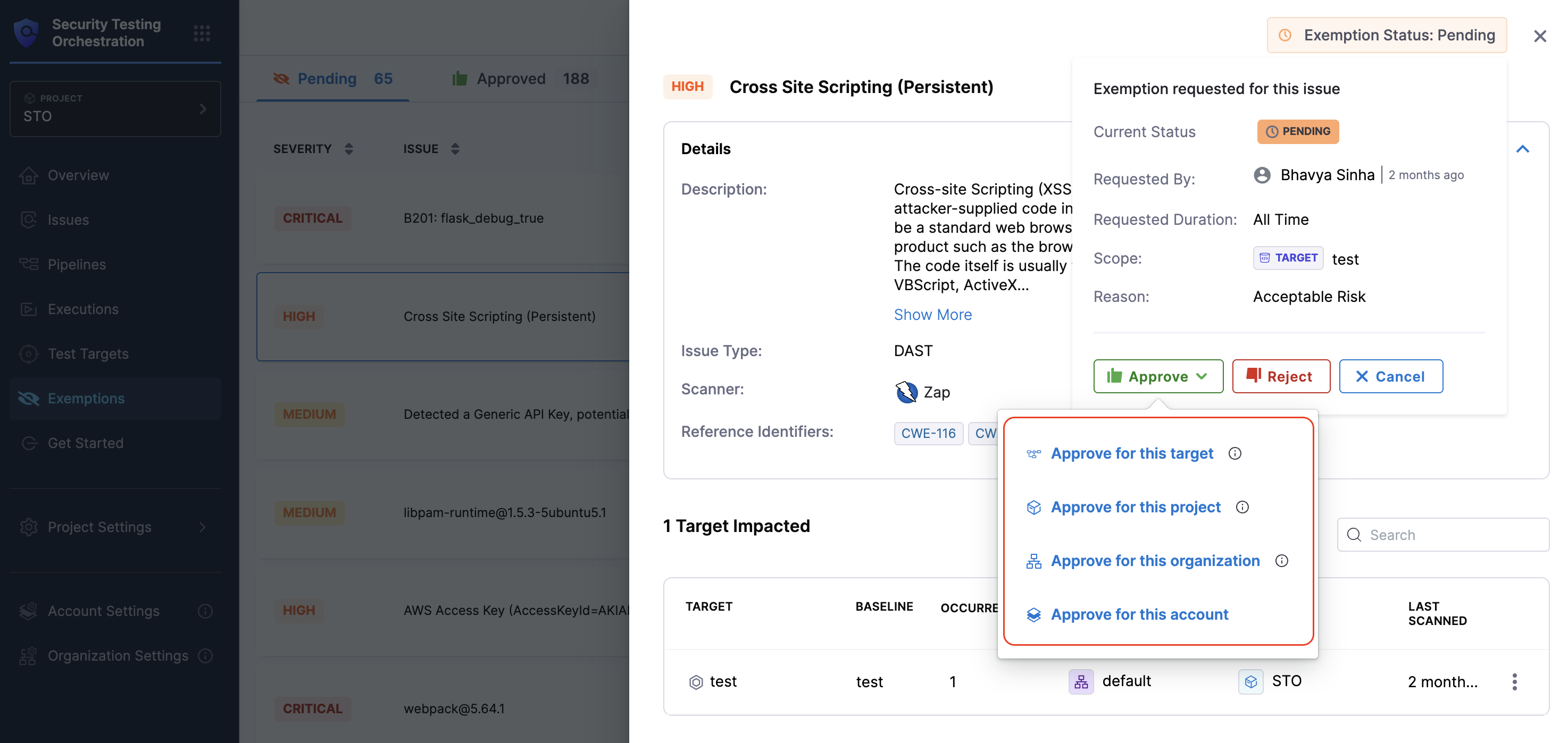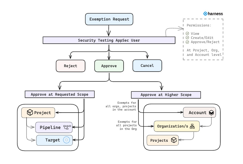 Each exemption request is associated with a specific scope, either a Pipeline, Target, or Project. Reviewers can approve the exemption at the requested scope or at a broader level, such as Organization or Account, as long as they have the appropriate permissions. Refer to the Required permissions for issue exemptions for more details.