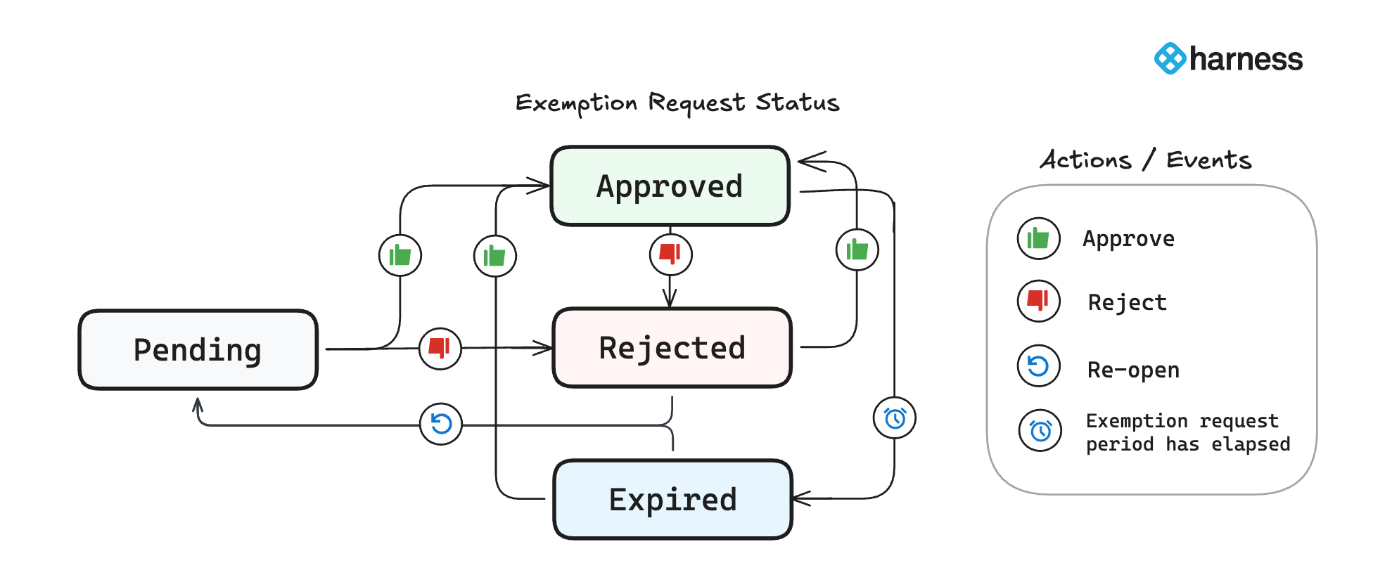 Expired and Rejected exemption requests with Organization or Account scope can only be moved to Approved by approving; those with Project, Pipeline, or Target scope can be moved to Pending by re-opening.