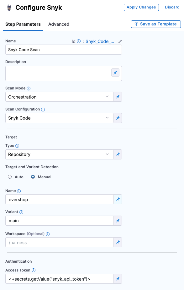 5. Under Authentication, pass your Snyk API as Harness secret, for example: <+secrets.getValue("snyk_api_token")>