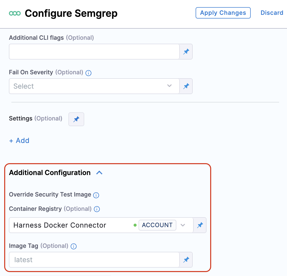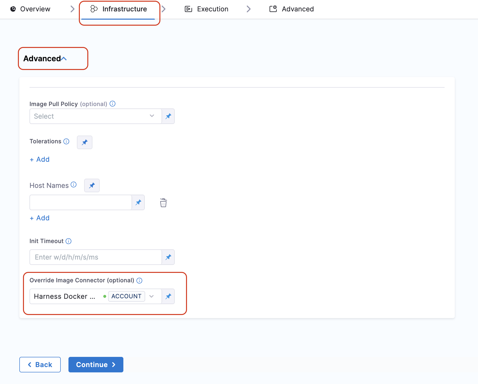 3. Set your private registry and tag under Override Security Test Image section. By default, the step will look for the latest tag if no tag is provided.
