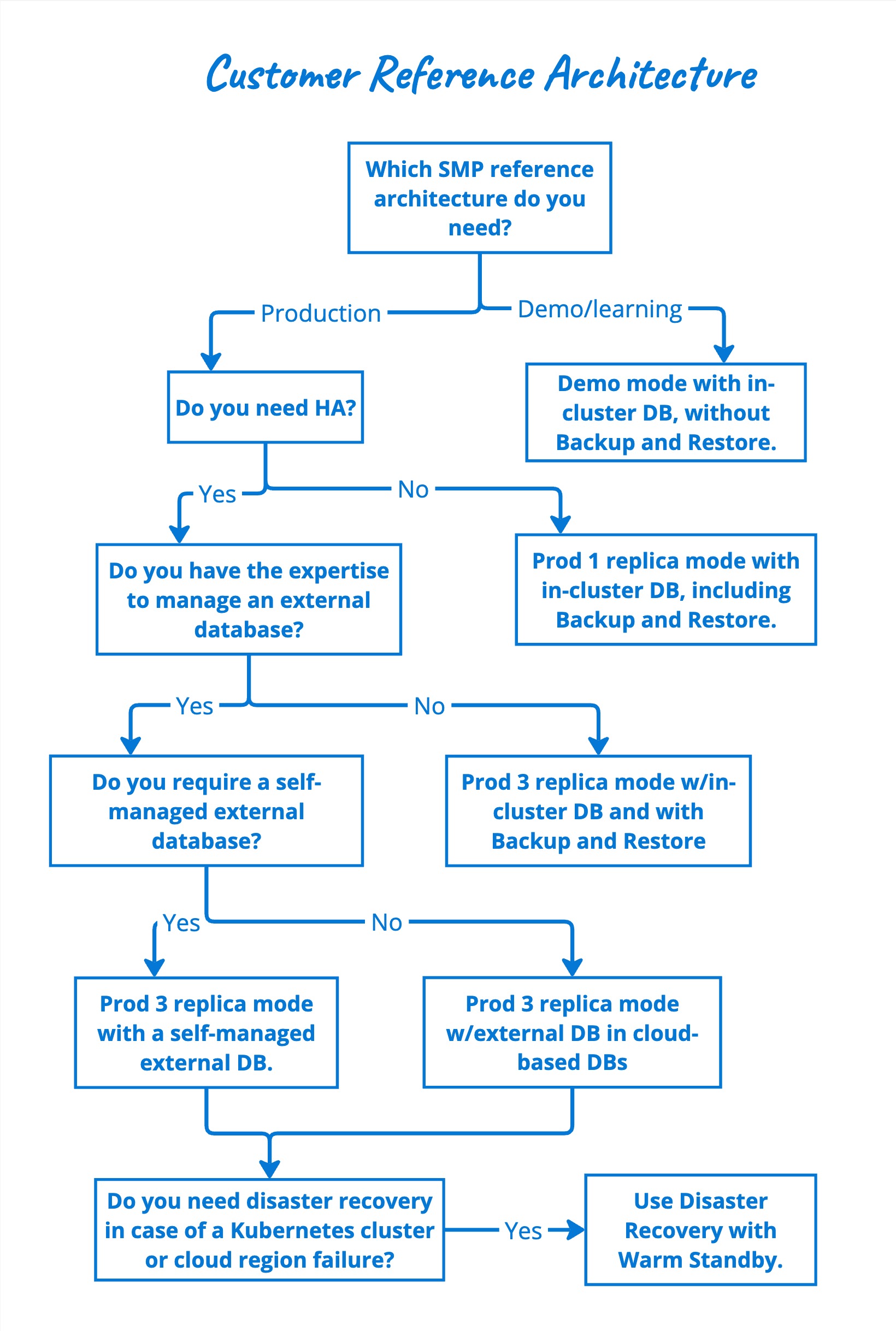 1. Demo mode: Designed for demonstration and learning purposes and includes an in-cluster database, but doesn't include backup and restore.