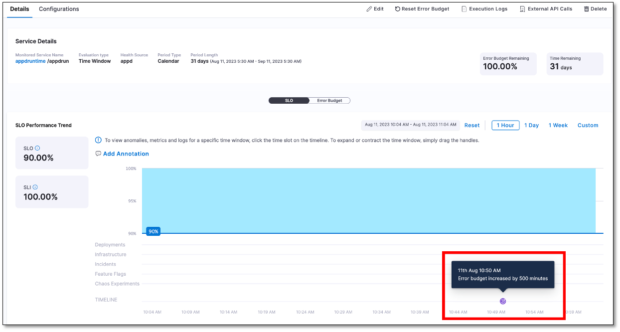 The error budget will be successfully reset. A marker appears on the SLO performance trend chart indicating the time when the error budget was reset. When you hover over the icon, error budget details are displayed. It may take up to 30 minutes for the reset icon to appear on the SLO performance trend chart.