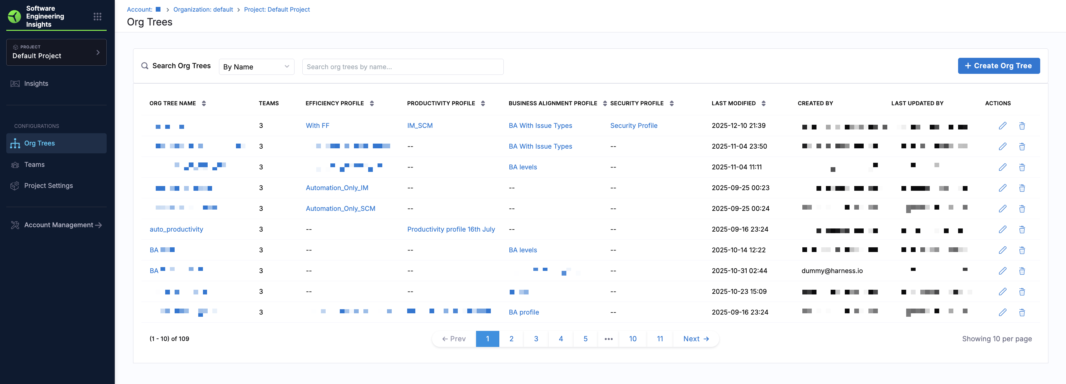 Use the Search Org Trees dropdown menu and search bar to search for Org Trees by associated profile or by name. The following information is available for each Org Tree: