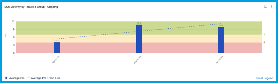 • Team 1 has a baseline of 10 commits per month as average and 5 commits per month as poor.