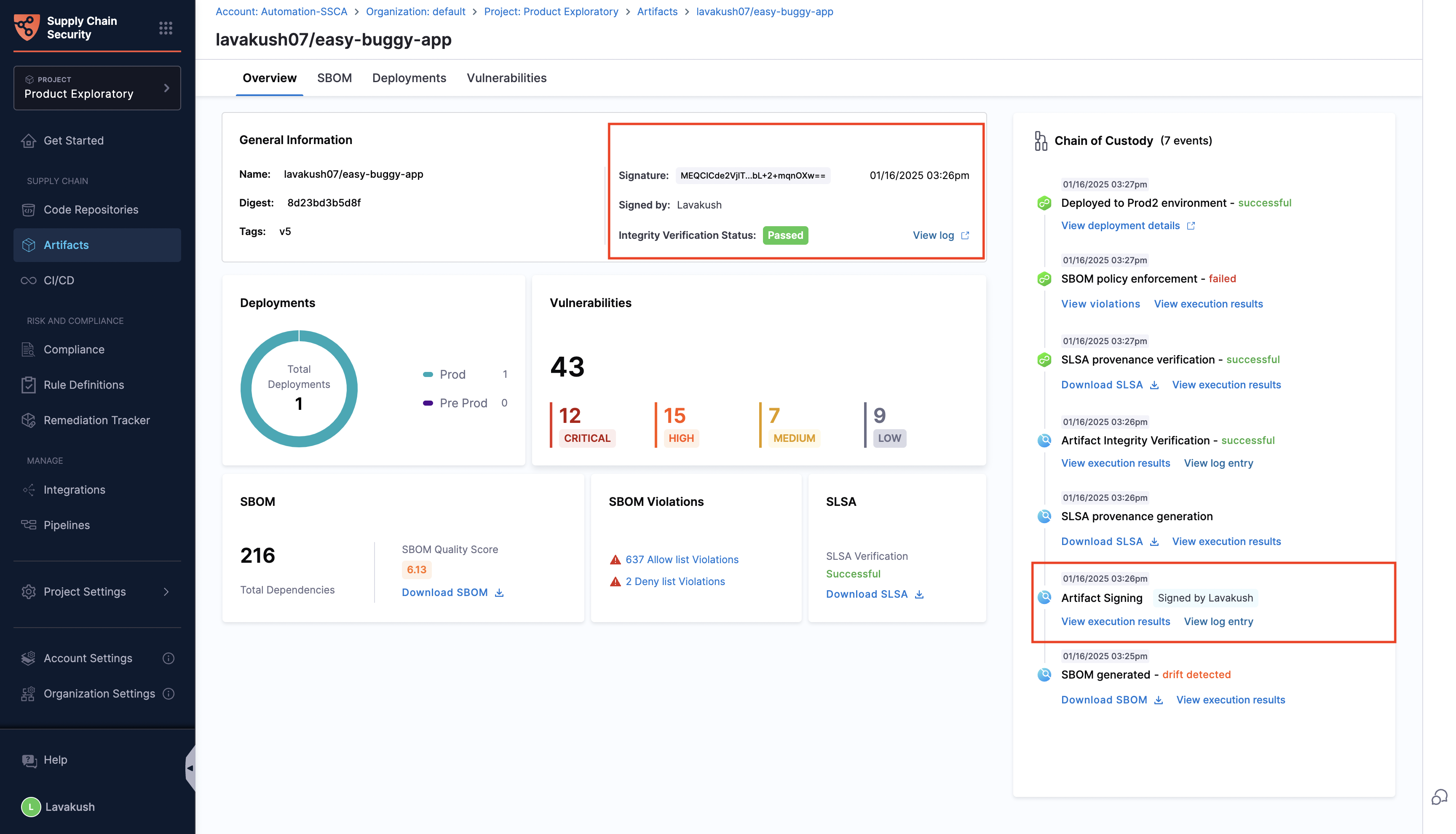 You can easily access the signed artifact details from the Artifacts Overview tab. This section shows the signature and who signed the artifact. Additionally, you can also find the artifact signing as an event in the Chain of Custody, where a new entry is logged every time you sign an artifact. This entry includes a link to the execution results and rekor log entry, allowing you to track the signing activity and cross-check the details.