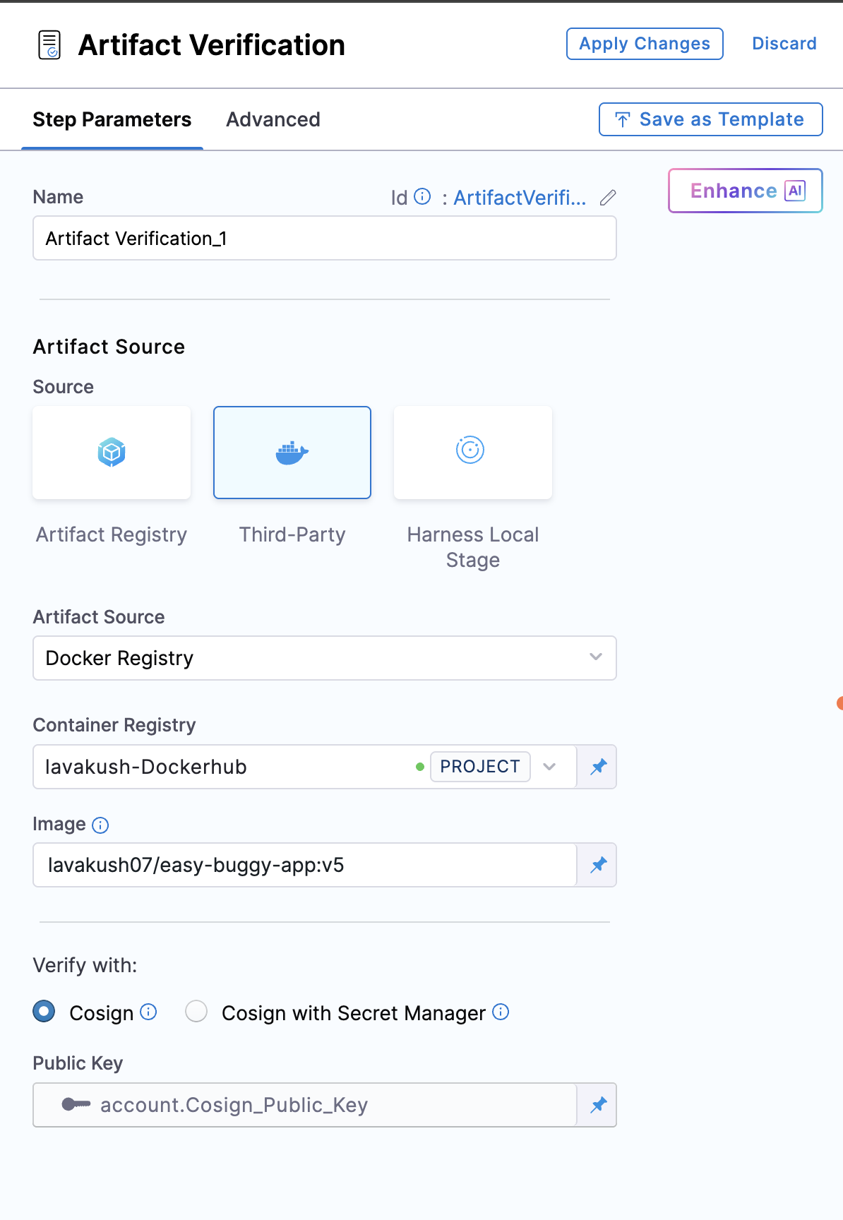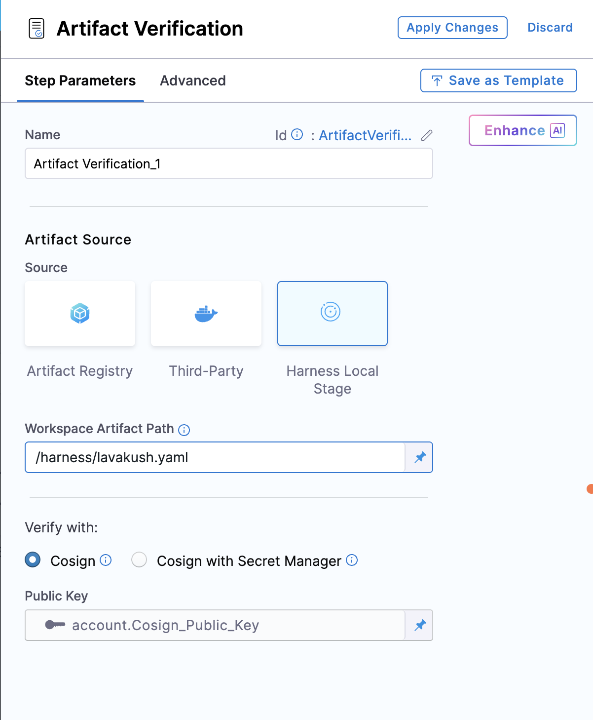 The Artifact Verification step pulls the .sig file from the artifact registry and verifies it with the corresponding public key. In the artifact signing step, if you have chosen not to push the .sig file to the registry, then for the artifact verification .sig file will instead be pulled from the Harness database. This process ensures that the artifact was signed by a trusted entity, thereby confirming its integrity and authenticity.